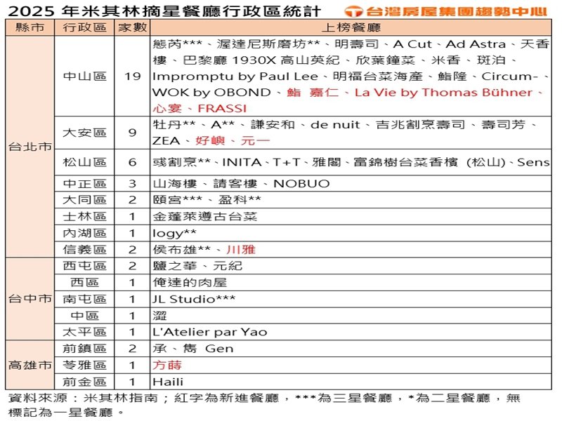2025年米其林摘星餐廳行政區統計。(台灣房屋提供)