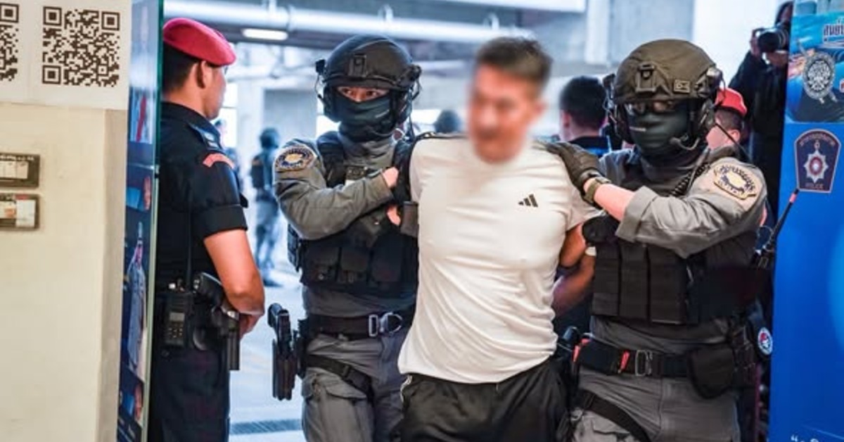 佘智江今天在泰國警方的押送下抵達曼谷機場,並被引渡回中國。(圖/翻攝自泰國皇家警察中央調查局臉書)